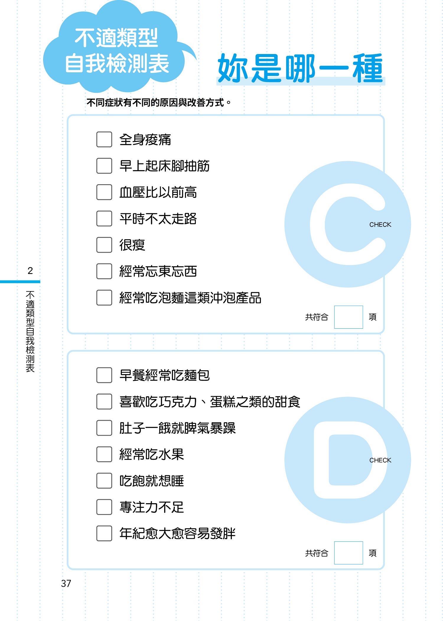 「只是有點不舒服,應該沒差吧?」——妳是不是也像這樣,輕易放過身體的「小病小痛」呢?小心!這些症狀可能是重大疾病的警訊。智春老師告訴大家五種「不適姐」應特別注意哪些血檢項目,如何判讀檢驗數值,以及各種健檢和癌症檢查的內容。想要進行自我健康管理的人,請千萬不要錯過!