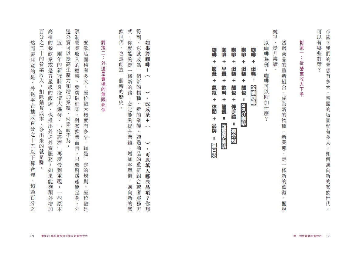 餐飲業者面對傳統困境,如何走出一條嶄新的路,創造一種新的業態、建立一個面對新世代屬於自己的、不朽的餐飲帝國?只要透過本書,不僅可以鑑古知今,了解餐飲業經過幾個世代的變與不變,也能夠學到新的想法、新觀點以及新做法,超前部署,贏在創業的起跑點。無論是新手創業、展店拓點,或是有志從事連鎖加盟的餐飲業者,這都是一本經營者不可不讀的餐飲業葵花寶典。
